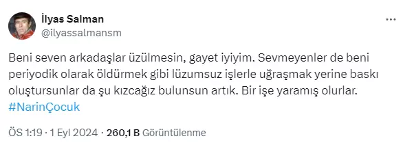 Paylaşımlara tepki gösteren Salman, Diyarbakır’da kaybolan Narin’i hatırlatarak “Beni seven arkadaşlar üzülmesin, gayet iyiyim. Beni periyodik olarak öldürmek gibi lüzumsuz işlerle uğraşmak yerine baskı oluşturun da şu kızcağız bulunsun artık. Bir işe yaramış olurlar” ifadelerini kullandı.
