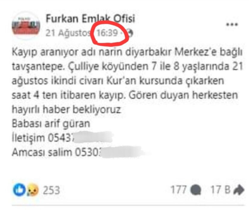 Narin’i öldürme suçlamasıyla tutuklanan amca Salim Güran, küçük kızın kaybolduğunu akşam saat 20.00’de öğrendiğini söyledi. Ancak olay günü saat 16:39’da sosyal medyadan Narin’in kaybolduğu mesajının yayınlandığı ortaya çıktı.