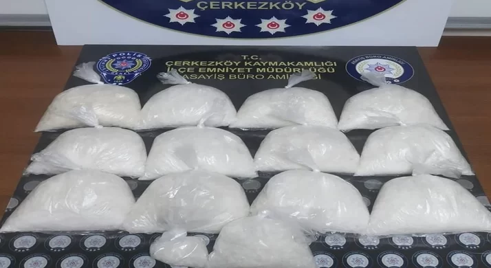 Tekirdağİl Emniyet Müdürlüğüne bağlı polis ekiplerince Çerkezköy ilçesinde yapılan çalışmalarda durumundan şüphelenilen bir araç durduruldu. Durdurulan araçta yapılan aramada, 14 poşet içerisinde 6 kilogram 300 gram metamfetamin maddesi ele geçirildi. Konu ile ilgili yakalanan 1 şahıs uyuşturucu ve uyarıcı madde ticareti yapmak suçundan gözaltına alınarak adliyeye sevk edildi. Mahkemeye çıkarılan şahıs tutuklandı.